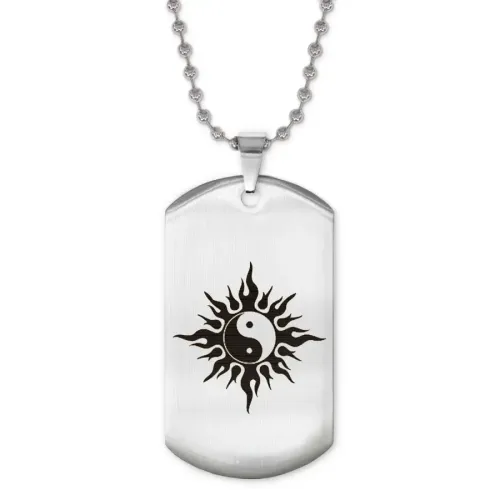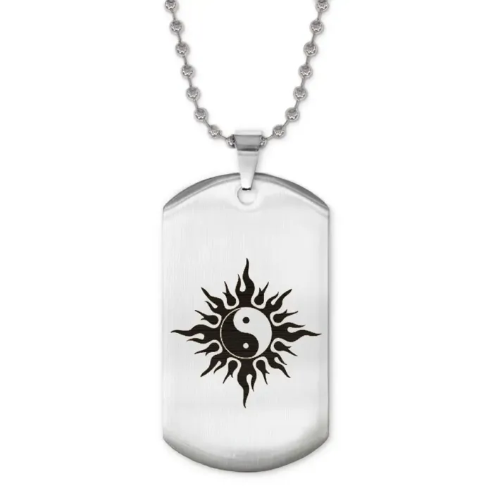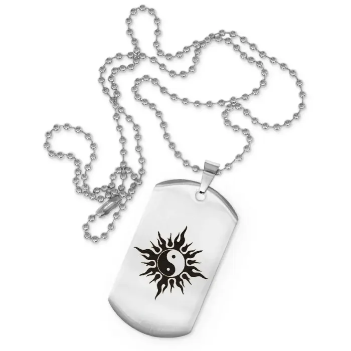 Сувенирный жетон на цепочке с лазерной гравировкой символа Инь-Ян и Солнца.
