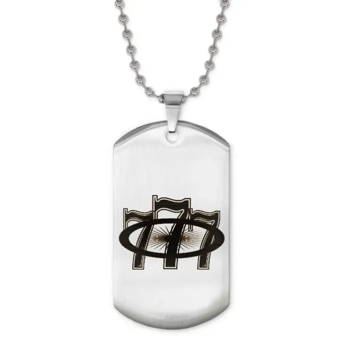 Жетон на цепочке из нержавеющей стали с лазерной гравировкой изображения трёх семёрок.