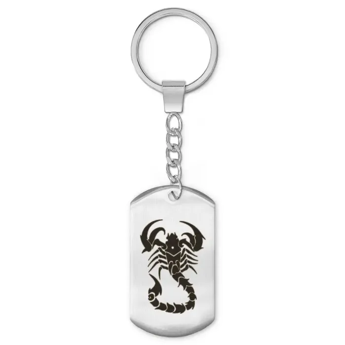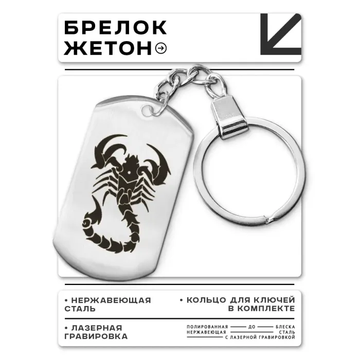 Брелок-жетон с изображением знака зодиака Скорпион. Изготовлен из полированной нержавеющей стали с лазерной гравировкой на одной стороне.