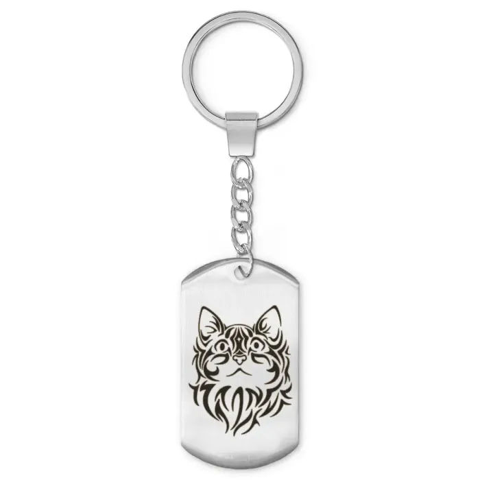 Брелок-жетон с изображением кота, выполненный из полированной нержавеющей стали с лазерной гравировкой.