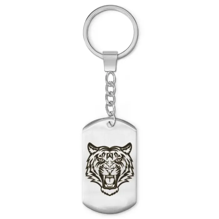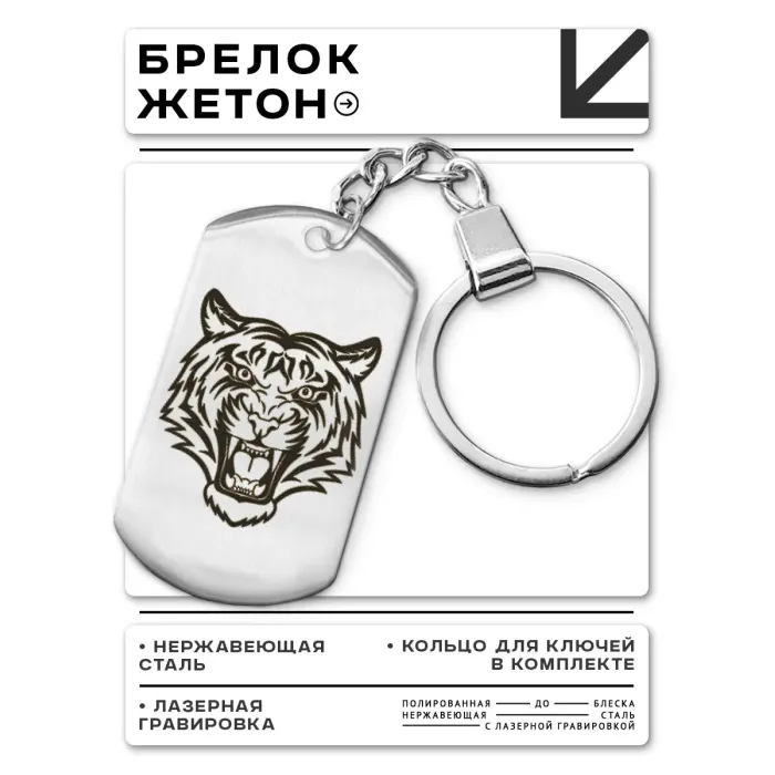 Брелок-жетон из полированной нержавеющей стали с лазерной гравировкой изображения тигра.