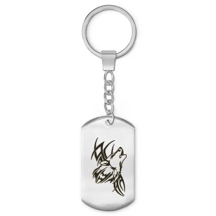 Брелок-жетон с изображением волка, выполненный из нержавеющей стали с зеркальной полировкой и лазерной гравировкой.
