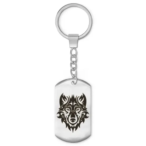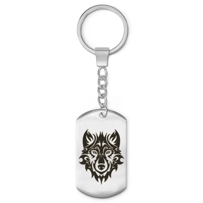 Брелок-жетон «Волк анфас» из полированной нержавеющей стали с лазерной гравировкой изображения на одной стороне.