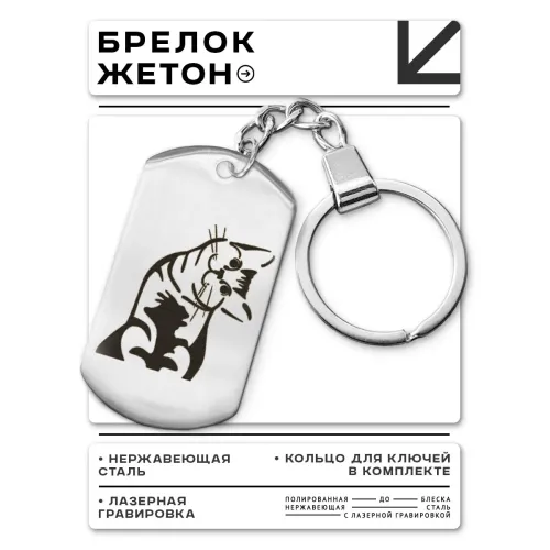 Брелок-жетон с изображением кошки, выполненный из нержавеющей стали с зеркальной полировкой и лазерной гравировкой.