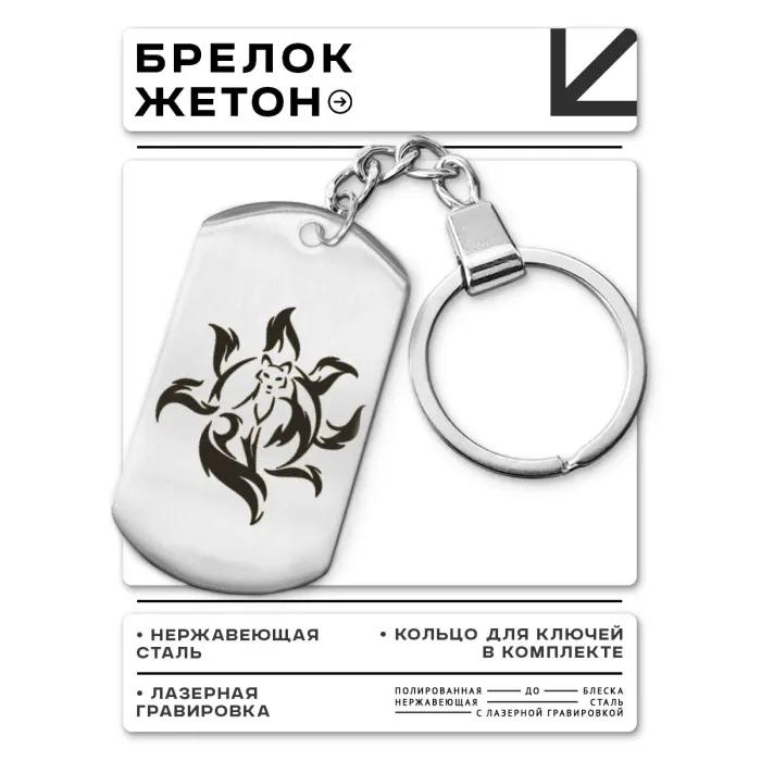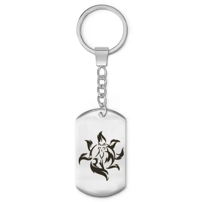 Брелок-жетон Кицунэ из полированной нержавеющей стали с лазерной гравировкой на одной стороне.