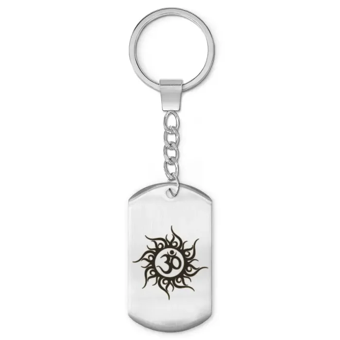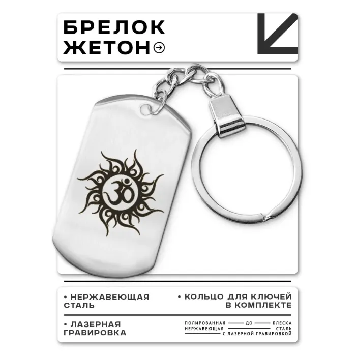 Брелок-жетон с символом Ом. Изготовлен из нержавеющей стали с зеркальной полировкой и лазерной гравировкой.