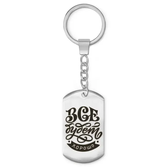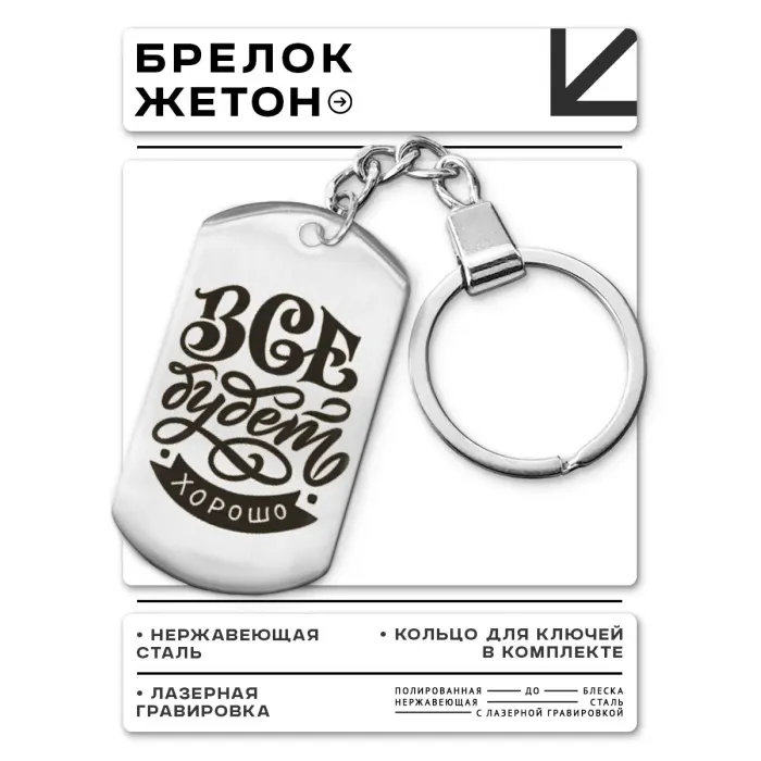 Брелок-жетон с надписью «Всё будет хорошо». Изготовлен из нержавеющей стали с зеркальной полировкой и лазерной гравировкой.