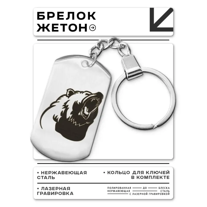 Брелок-жетон из нержавеющей стали с лазерной гравировкой изображения медведя.