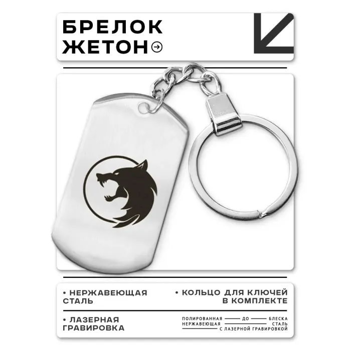 Брелок-жетон из нержавеющей стали с лазерной гравировкой изображения волка на фоне полнолуния.