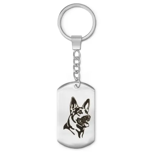 Брелок-жетон с портретом овчарки. Изготовлен из нержавеющей стали с зеркальной полировкой и лазерной гравировкой.
