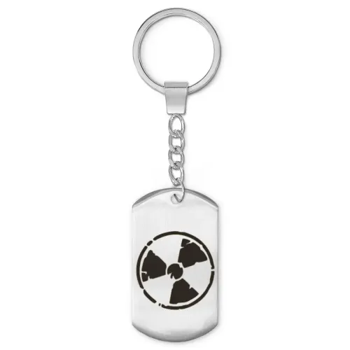 Брелок-жетон с изображением знака радиации. Изготовлен из нержавеющей стали с зеркальной полировкой и лазерной гравировкой.