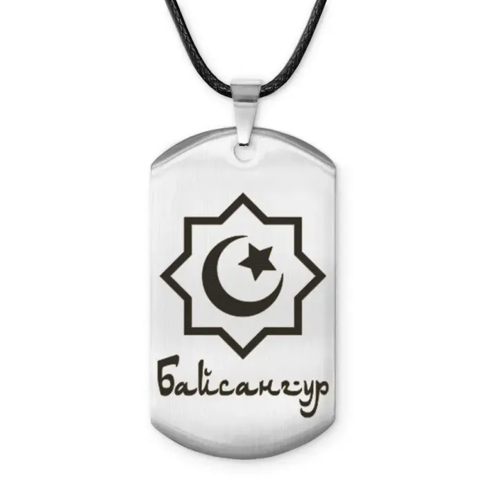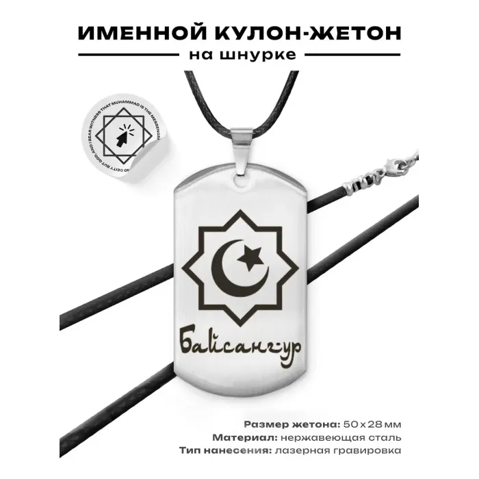Мусульманский именной жетон Байсангур — амулет из нержавеющей стали с зеркальной полировкой и лазерной гравировкой.