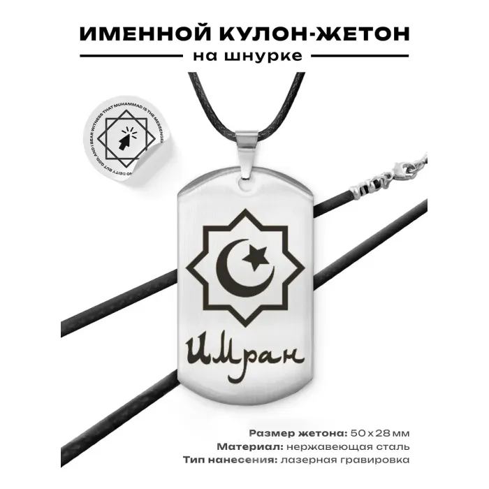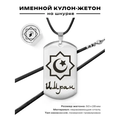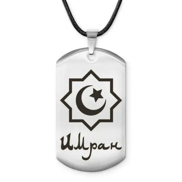 Мусульманский именной жетон Имран выполнен из нержавеющей стали с полированной зеркальной поверхностью и лазерной гравировкой.
