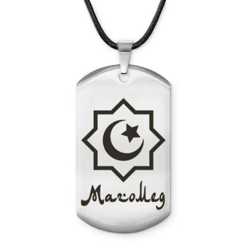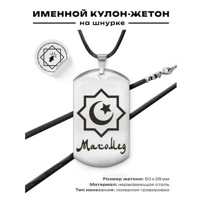 Мусульманский именной жетон — амулет из нержавеющей стали с лазерной гравировкой на одной стороне и зеркальной полировкой на другой.