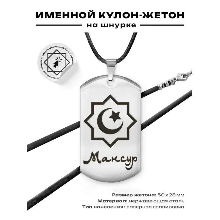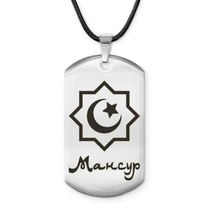 Мусульманский именной жетон Мансур — амулет из полированной нержавеющей стали с лазерной гравировкой.