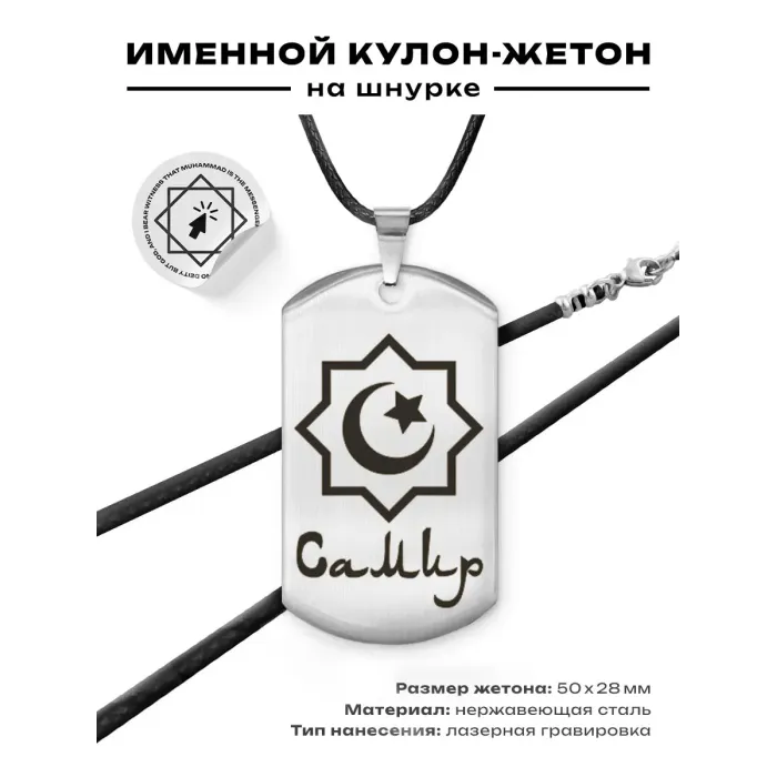 Мусульманский именной жетон «Самир» из полированной нержавеющей стали с лазерной гравировкой.