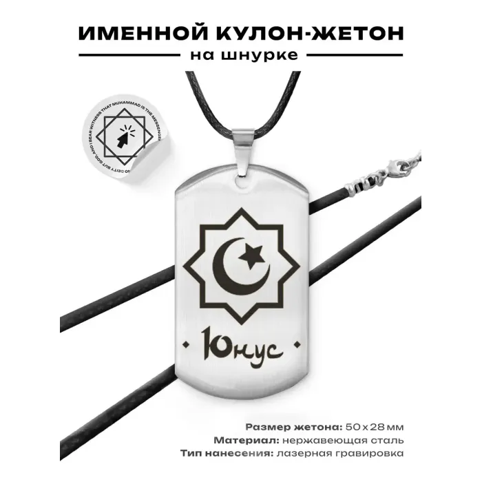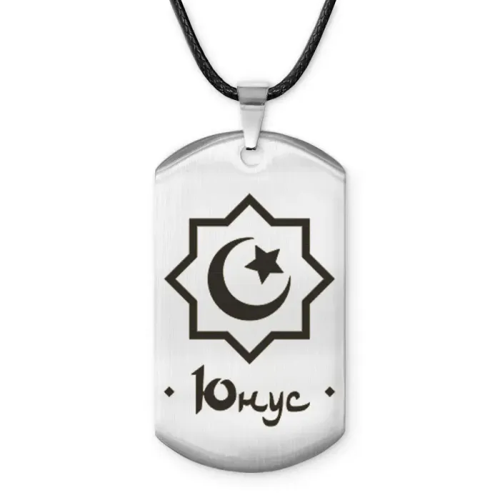 Мусульманский именной жетон Юнус из полированной нержавеющей стали с лазерной гравировкой.