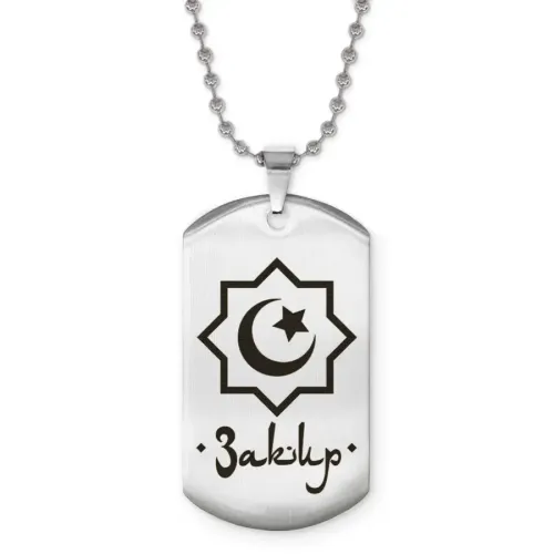 Именной кулон для ношения, выполненный из нержавеющей стали с зеркальной полировкой и лазерной гравировкой.