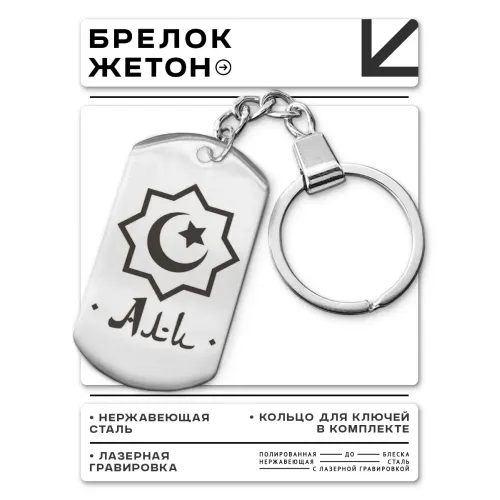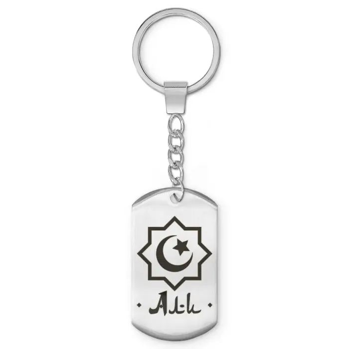 Мусульманский именной брелок-жетон из нержавеющей стали с лазерной гравировкой имени на одной стороне.