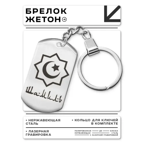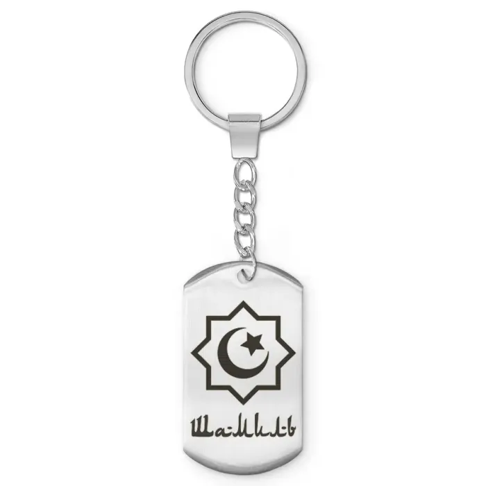 Мусульманский именной брелок. Изготовлен из нержавеющей стали с зеркальным блеском, украшен лазерной гравировкой имени.