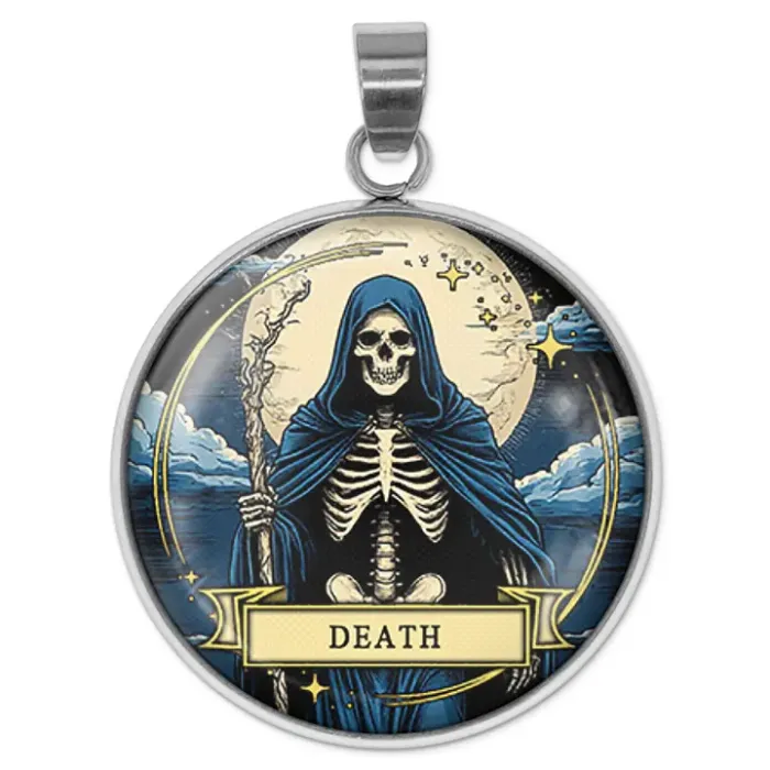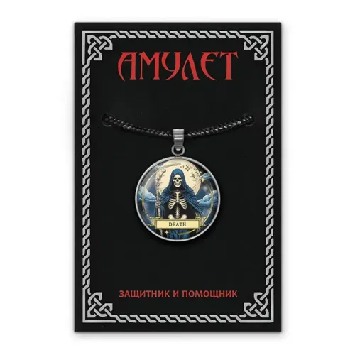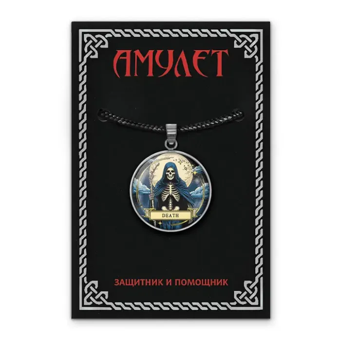 Кулон-амулет с символикой карты Таро «Смерть». Изготовлен из нержавеющей стали, изображение защищено выпуклой стеклянной линзой.