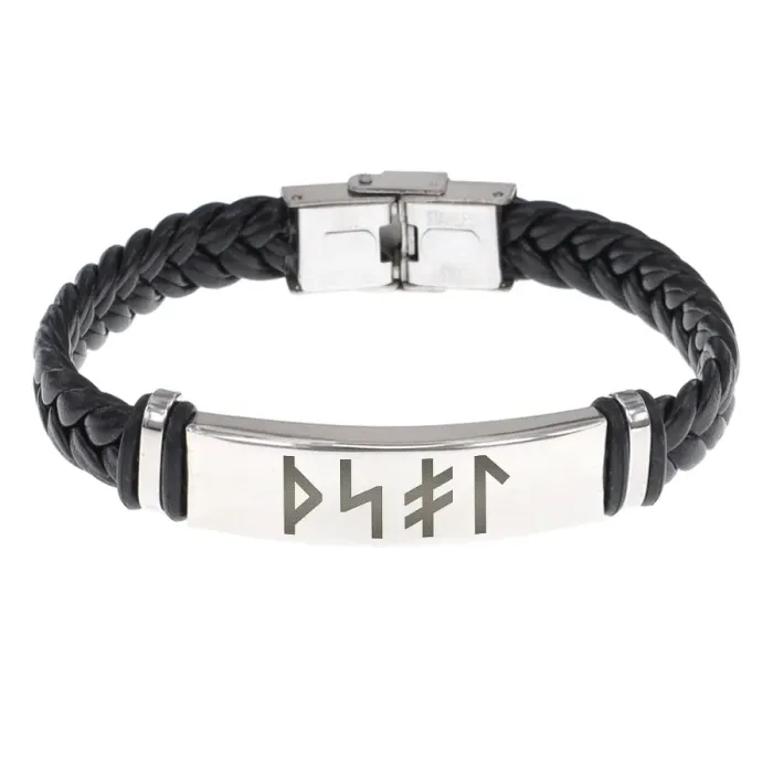 Кожаный плетёный браслет с гравировкой славянской рунической формулы.