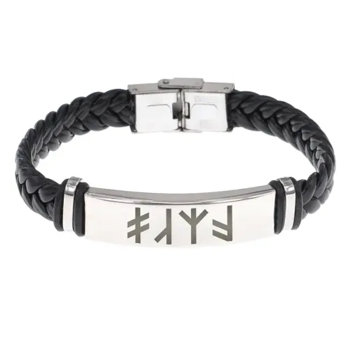 Кожаный плетёный браслет с гравировкой славянской рунической формулы.