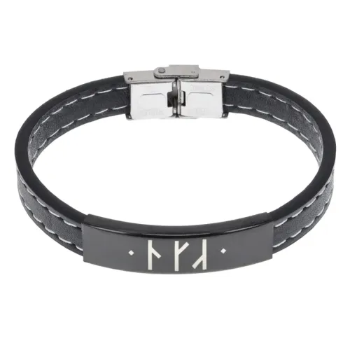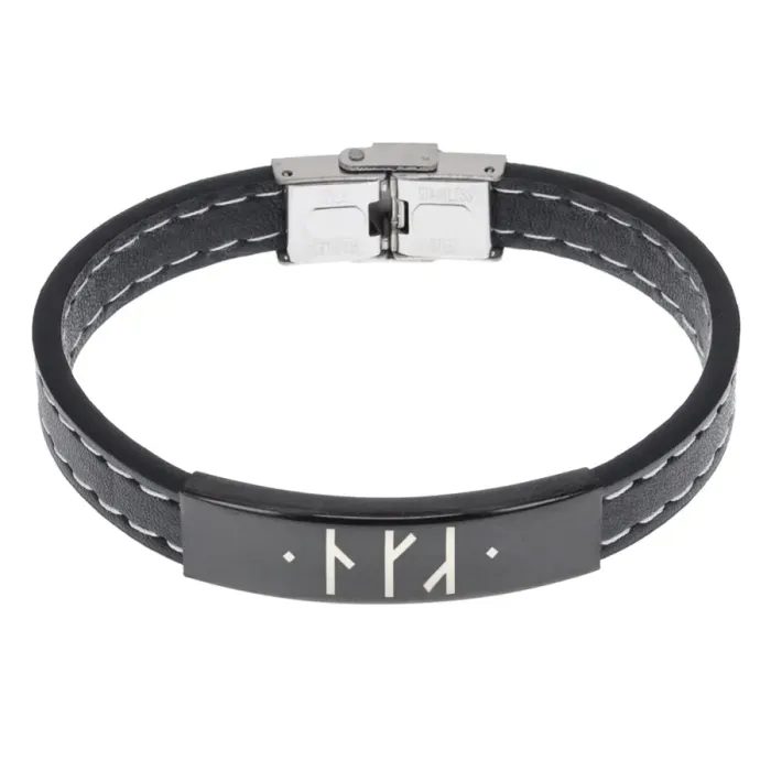 Славянский браслет-оберег из кожи и нержавеющей стали с гравировкой рунической формулы Исцеление.