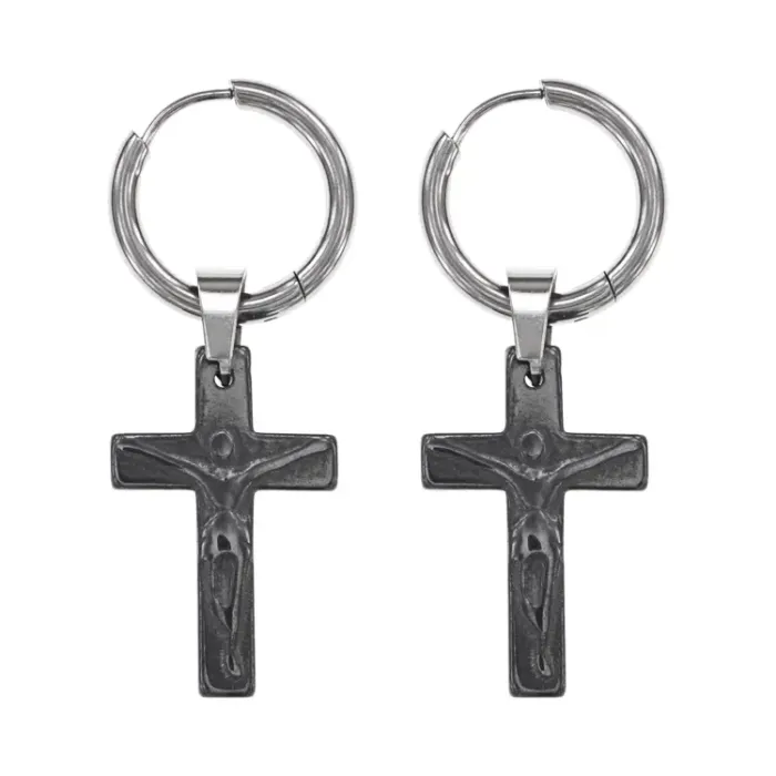 Серьги-конго из гипоаллергенного сплава с синтетическим камнем гематит и подвеской в виде распятия.