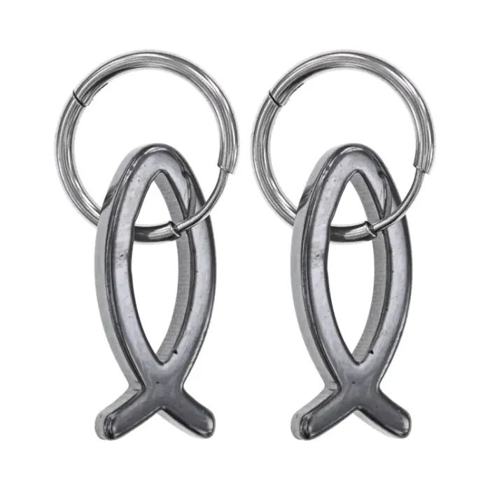 Серьги-конго с подвеской в форме Ихтис и синтетическим камнем гематит.