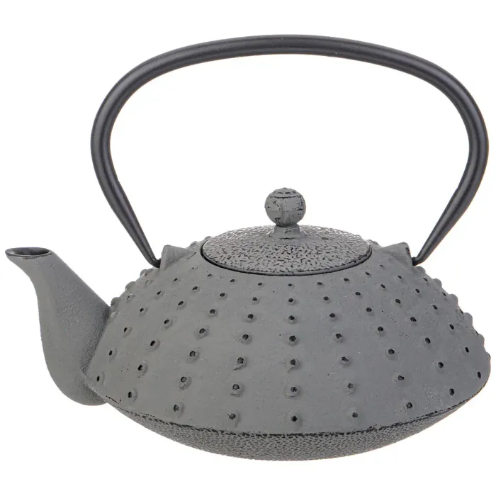 Корпус чайника изготовлен из чугуна. Внутренняя поверхность покрыта эмалью для защиты материала и обеспечения гигиеничности. Конструкция включает ситечко для удержания заварки. Чайник имеет компактные размеры.