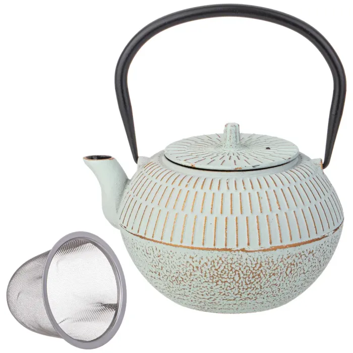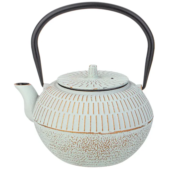Корпус чайника изготовлен из чугуна, что обеспечивает высокую прочность и способствует равномерному распределению тепла для стабильного прогрева заварки. Внутреннее эмалевое покрытие нанесено для повышения гигиеничности и долговечности изделия. Конструкция включает встроенное ситечко для удержания чайных листьев.