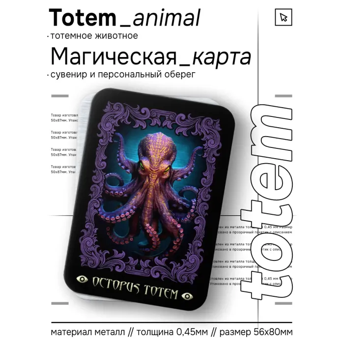 Магическая карта Totem размером 5,6х8 см изготовлена из металла толщиной 0,45 мм и упакована в пакетик с описанием. Тотемное животное Осьминог символизирует сосредоточение и баланс, даруя спокойствие и умение контролировать эмоции. Эта карта помогает принимать правильные решения в трудных ситуациях, что делает её ценным амулетом для каждого. Вдохновленная культурными традициями, магическая карта станет не только оригинальным подарком, но и надежным помощником в повседневной жизни.
