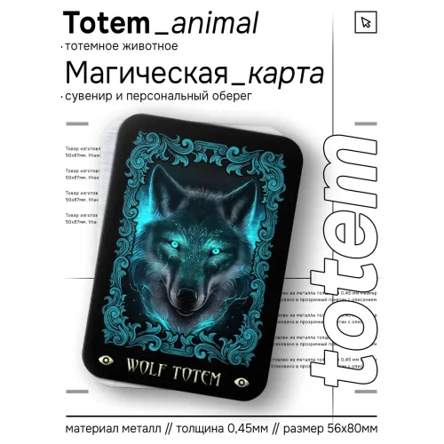 Магическая карта Totem – это удивительный сувенир, который сочетает в себе силу и символику тотемного животного. Размер карты составляет 5,6х8 см, она изготовлена из металла толщиной 0,45 мм и упакована в пакетик с описанием. Волк как тотемное животное олицетворяет мужественность, смелость и силу. Люди под его покровительством никогда не отступают и всегда готовы защитить своих близких. Этот предмет станет отличным подарком для тех, кто ценит дух свободы и стойкость характера.