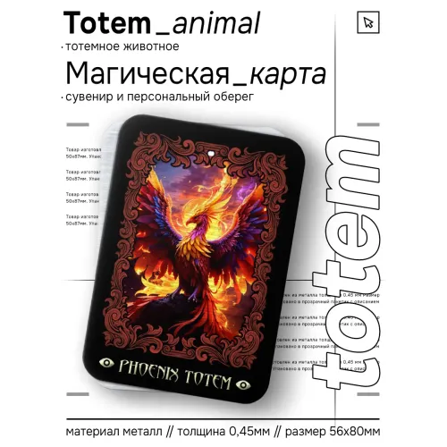 Магическая карта Totem размером 5,6х8 см изготовлена из металла толщиной 0,45 мм и упакована в пакетик с описанием. Тотемное животное Феникс символизирует мистическое и духовное возрождение, традиционно используется для поддержки спиритуального развития и обретения новых знаний. Эта карта станет отличным подарком для тех, кто стремится к самосовершенствованию и поиску глубоких смыслов в жизни.