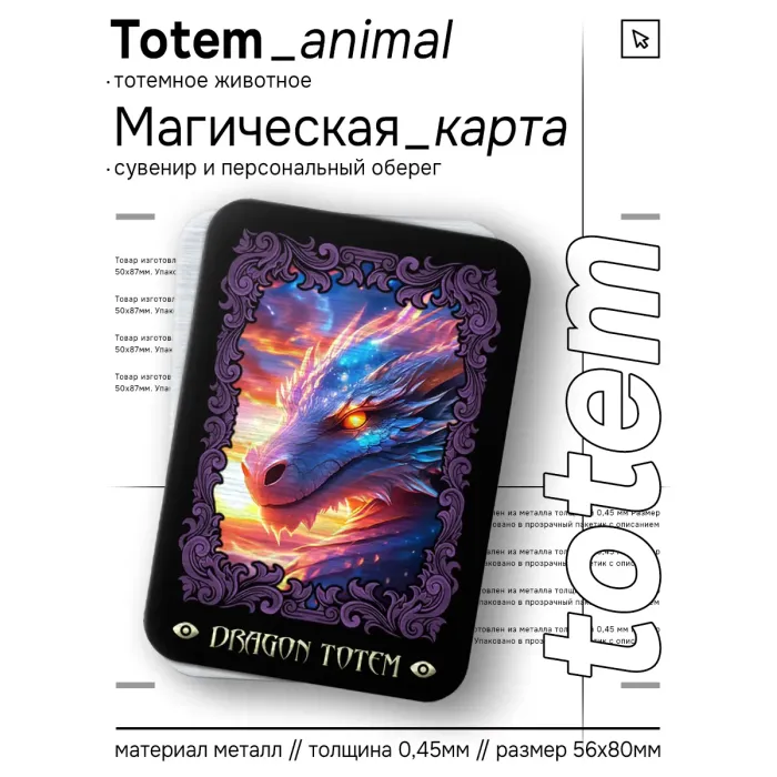 Магическая карта Totem с изображением Дракона — это не просто сувенир, а мощный символ власти и силы. Размер карты составляет 5,6х8 см, она изготовлена из металла толщиной 0,45 мм и поставляется в пакетике с описанием. Тотемное животное Дракон олицетворяет мудрость и проницательность, наполняя владельца энергией для достижения целей. Эта карта станет отличным подарком или элементом декора для тех, кто ценит силу символов и их влияние на жизнь.