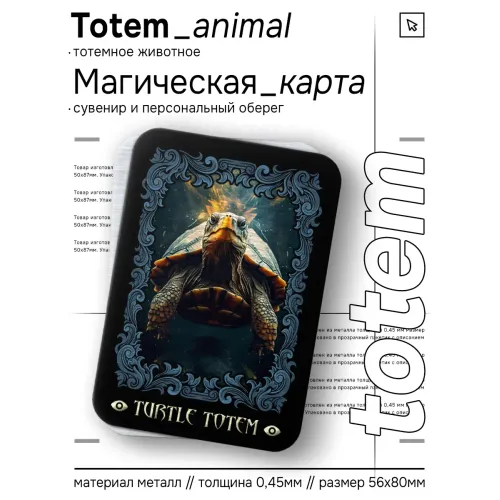 Магическая карта Totem размером 5,6х8 см выполнена из металла толщиной 0,45 мм и упакована в пакетик с описанием. Тотемное животное Черепаха символизирует мудрость, долголетие и нерушимость. Эта карта помогает находить гармонию с окружающим миром и людьми, олицетворяя спокойствие и уравновешенность. Такой сувенир станет отличным подарком для тех, кто ценит глубокий смысл и традиции.