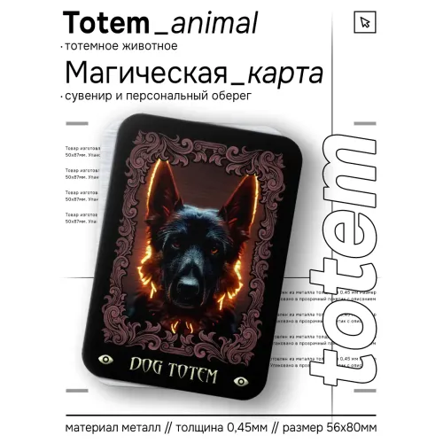 Магическая карта Totem размером 5,6х8 см изготовлена из металла толщиной 0,45 мм и упакована в пакетик с описанием. Тотемное животное Собака символизирует отвагу, честь, дружбу и благородство. Люди, оберегаемые этим тотемом, обладают силой духа и смелостью. Тотем Собаки традиционно используется для поиска смысла жизни, достижения успеха в карьере и бизнесе, а также для обретения уверенности в себе.