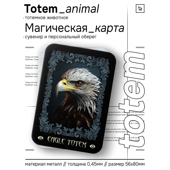 Магическая карта Totem размером 5,6х8 см изготовлена из металла толщиной 0,45 мм и упакована в пакетик с описанием. Тотемное животное Орёл символизирует власть, благородство и отвагу. Люди, находящиеся под защитой орла, достигают своих целей благодаря невероятной силе воли. Эта карта станет не только стильным аксессуаром, но и источником вдохновения для преодоления трудностей.