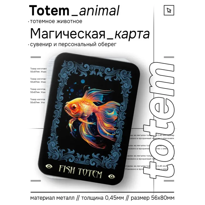 Магическая карта Totem размером 5,6х8 см выполнена из металла толщиной 0,45 мм и упакована в пакетик с описанием. Тотемное животное Рыба символизирует мудрость, интуицию и спокойствие. Эта карта помогает понять себя и найти свой путь в жизни, обладая силой для достижения счастья. Она станет прекрасным подарком для тех, кто стремится к гармонии и внутреннему балансу.