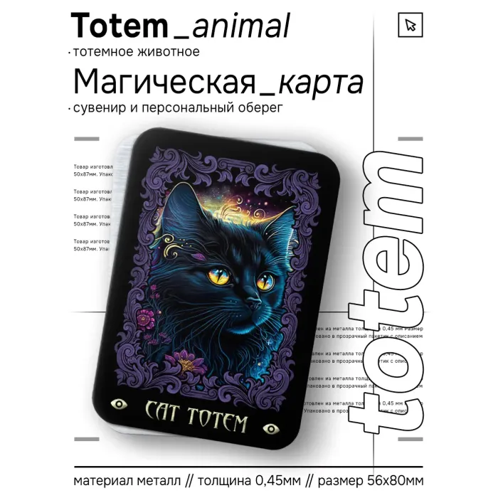 Магическая карта Totem размером 5,6х8 см изготовлена из металла толщиной 0,45 мм и упакована в пакетик с описанием. Тотемное животное Кошка символизирует красоту, грацию, мудрость и силу. Эта карта традиционно используется для привлечения успеха в любых начинаниях и защиты от неприятностей. Люди с тотемом Кошки отличаются умом, сообразительностью и целеустремленностью, что делает этот сувенир отличным подарком для тех, кто стремится к самосовершенствованию.