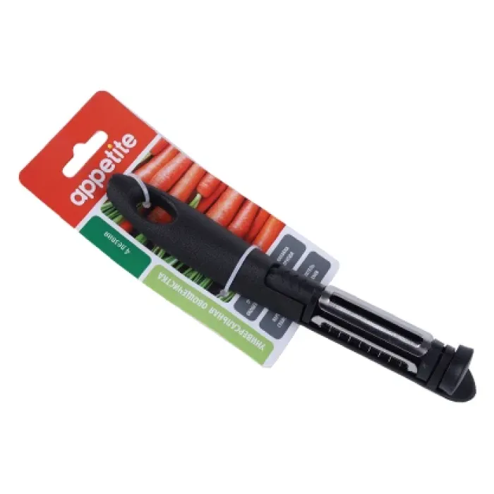Овощечистка TM Appetite предназначена для очистки овощей и фруктов. Инструмент оснащён четырьмя лезвиями из нержавеющей стали, что обеспечивает эффективную работу, а корпус из пластика делает его лёгким и долговечным.
