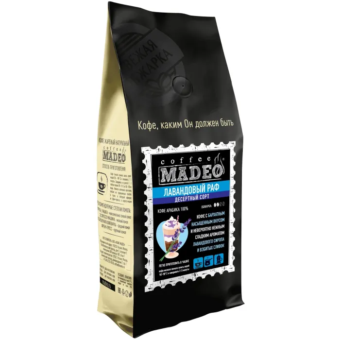 Десертный кофе в зёрнах Madeo «Лавандовый раф» создан на основе 100% арабики из стран Латинской Америки. Средняя обжарка даёт напитку плотное тело и сбалансированную горчинку, а низкая кислотность делает вкус мягким. Вкусовой профиль раскрывается через насыщенные ноты сливок и нежный аромат лавандового сиропа.