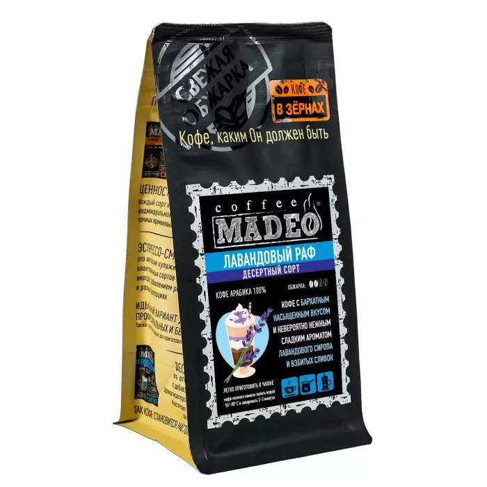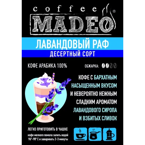 Десертный молотый кофе Madeo «Лавандовый раф» создан для любителей сладких кофейных напитков. В его основе — арабика из стран Латинской Америки, обжаренная до средней степени. Вкус отличается бархатистой текстурой, низкой кислотностью, плотным телом и умеренной горечью с нотами лавандового сиропа и взбитых сливок.