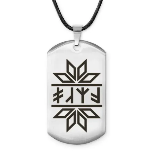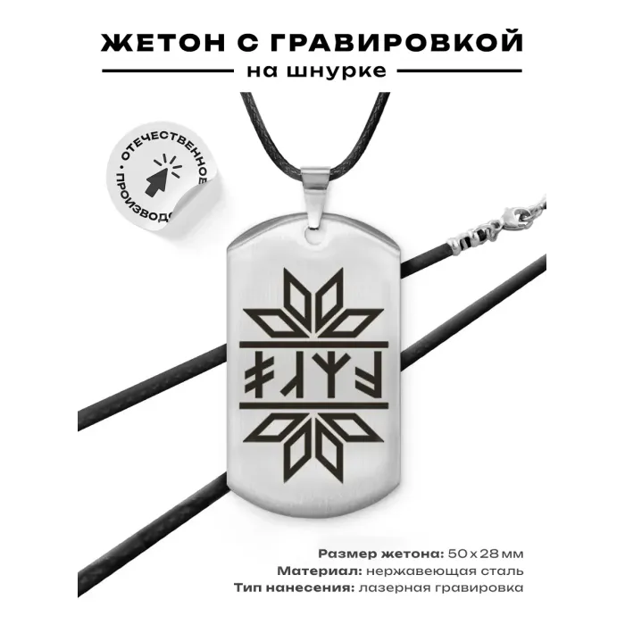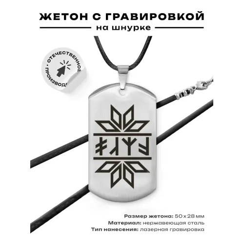 Амулет-жетон для сувенирного или коллекционного использования, выполненный из нержавеющей стали, с нанесённой славянской рунической формулой.