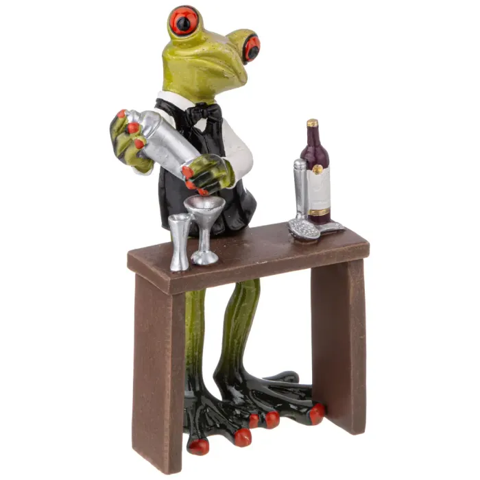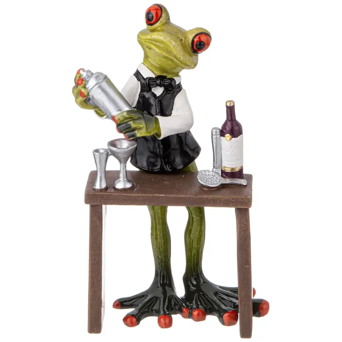 Фигурка Лягушка-бармен гармонично сочетается с другими декоративными элементами из серии Фрогги. Она может стать частью коллекции или самостоятельным украшением комнаты. Подходит для использования как дома, так и в офисе или кафе.