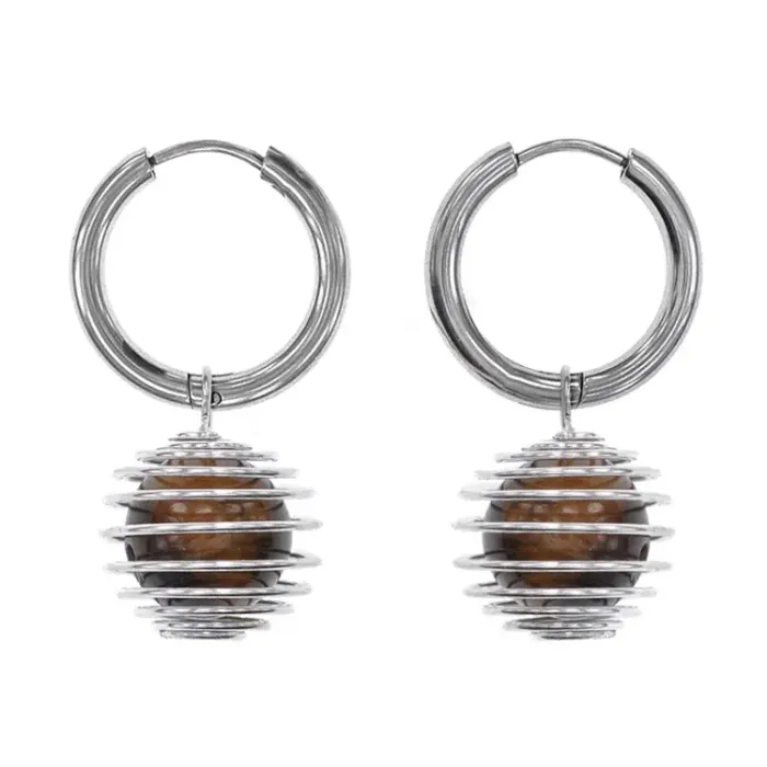 Серьги-амулеты из гипоаллергенного сплава с натуральным камнем Тигровый глаз в подвеске-клетке.