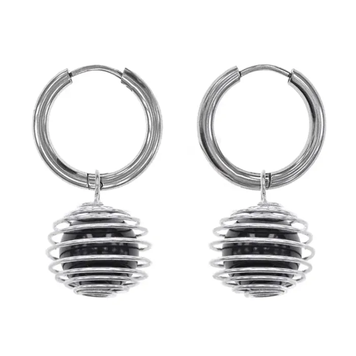 Серьги-амулеты из гипоаллергенного сплава с натуральным камнем черный агат в подвеске «клетка». Симметричный дизайн.