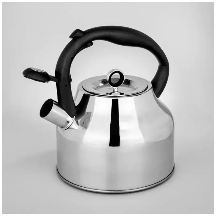 Корпус чайника изготовлен из нержавеющей стали, что обеспечивает прочность и устойчивость к коррозии. Конструкция включает эргономичную ручку для удобного использования и встроенный свисток, который подаёт звуковой сигнал при закипании воды.
