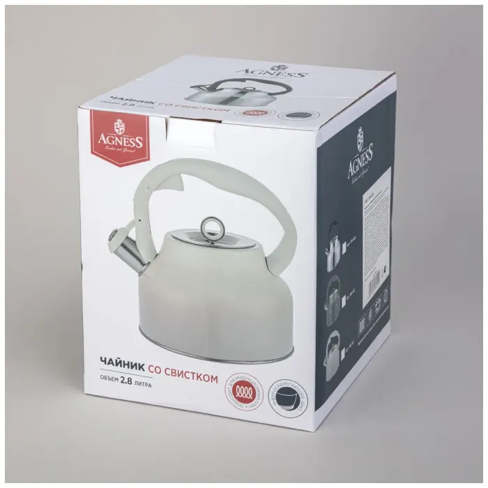 Чайник со свистком Agness предназначен для кипячения воды на плите. Изделие из нержавеющей стали объёмом 2,8 литра рассчитано на приготовление горячих напитков для нескольких человек.